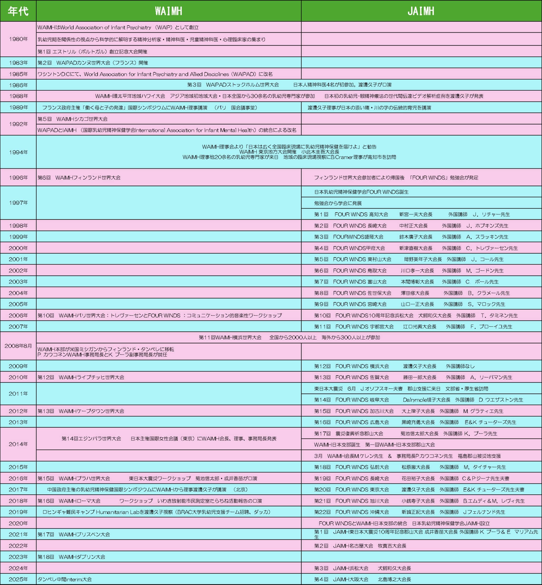 WAIMHは1980年にWorld Association of Infant Psychiatry (WAIP)として創立されました。ついで1985年にワシントンD.Cにて、World Association for Infant Psychiatry and Allied Disciplines (WAIPAD)となり、1992に名前がWAIMHに変わりました。それは、World Association for Infant Mental Health and Allied Disciplines(WAIPAD)と国際乳幼児精神保健学会International Association for Infant Mental Health (IAIMH)の統合によるものです。